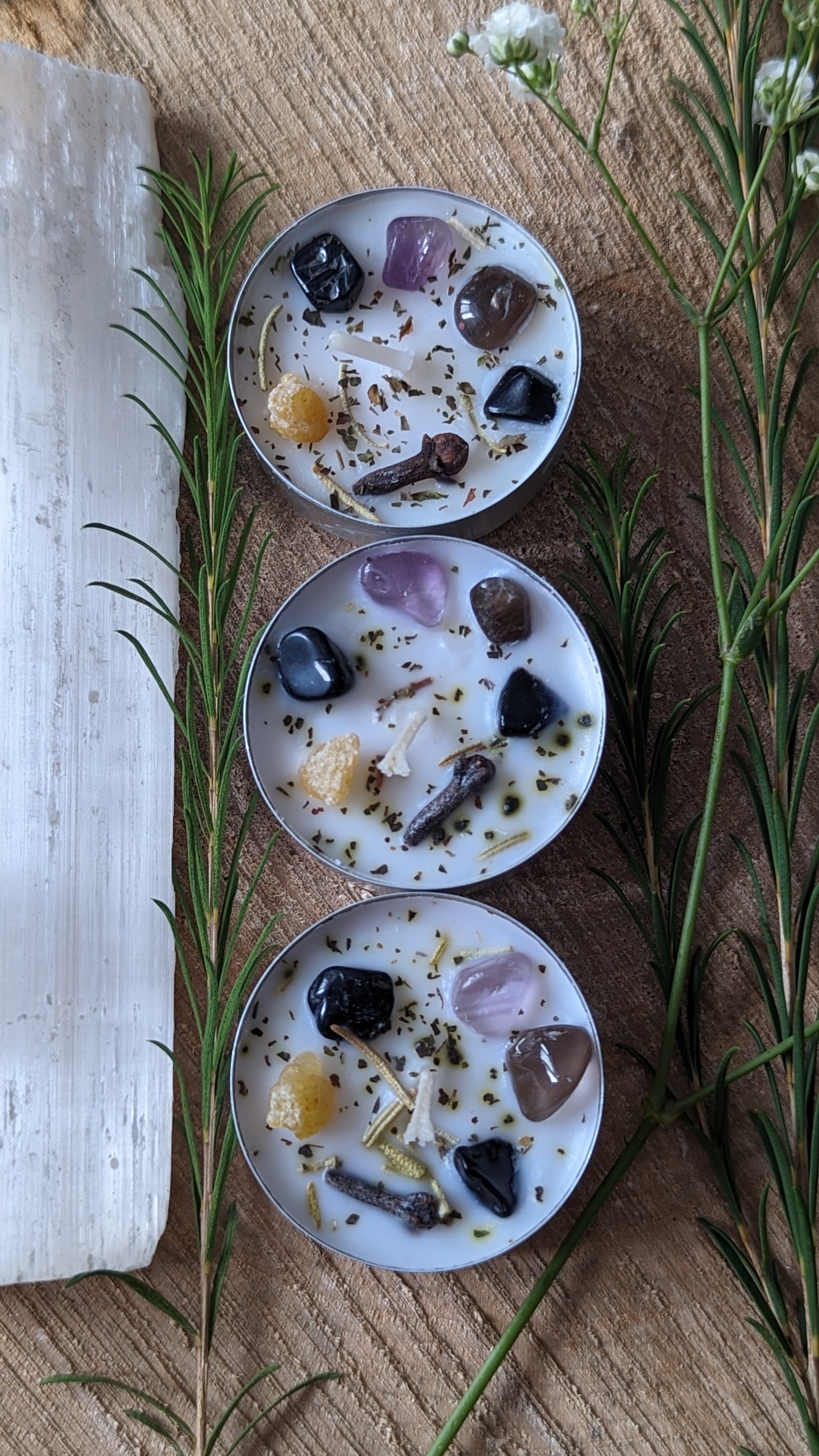 Chaque bougie est accompagnée d'une fiche informative détaillant les propriétés des herbes et cristaux utilisés, vous permettant de les allumer tout en infusant vos propres intentions dans le sortilège. Ces bougies sont l'outil idéal, toujours à portée de main pour vos pratiques magiques.